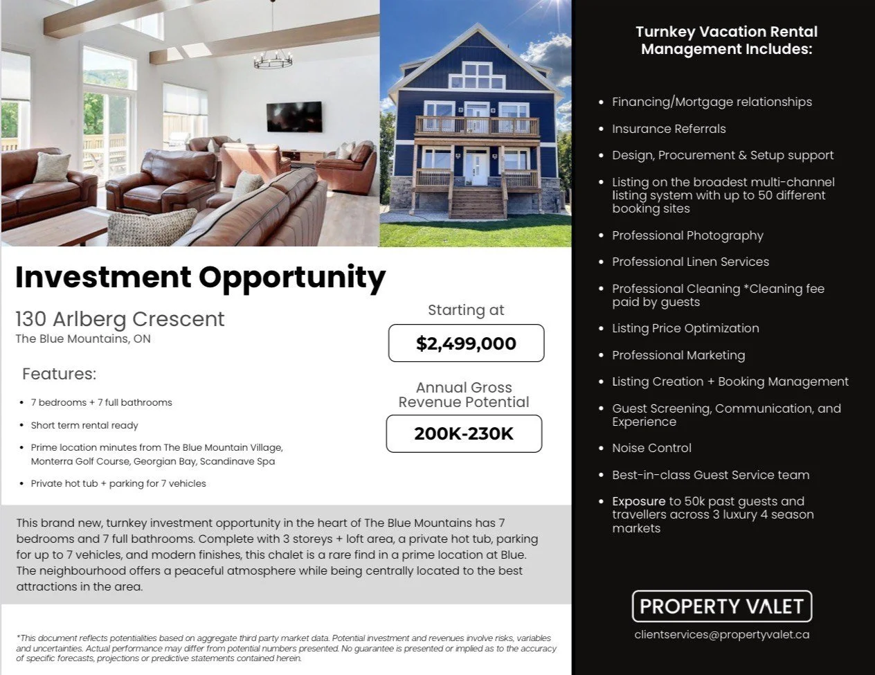 A rare turnkey short-term rental opportunity in the heart of The Blue Mountains, Ontario. This 3-storey chalet features 7 bedrooms, 7 bathrooms, a private hot tub, loft area, and parking for 7 vehicles, perfect for large groups and year-round rentals.